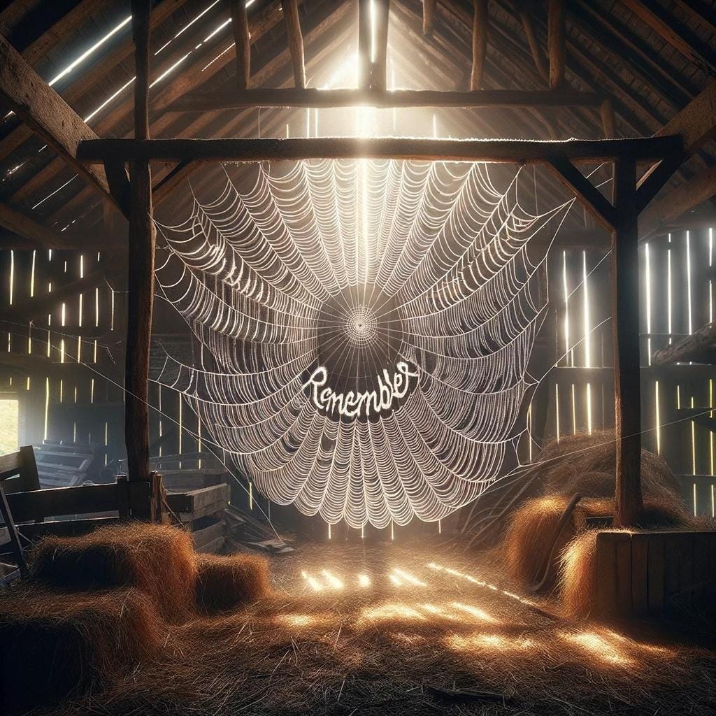 “Grandpa!” called Adam from the barn. Avery saw his grandson pointing up at the corner. The morning sun rising caught and reflected the dew on the web. He looked for a long time.