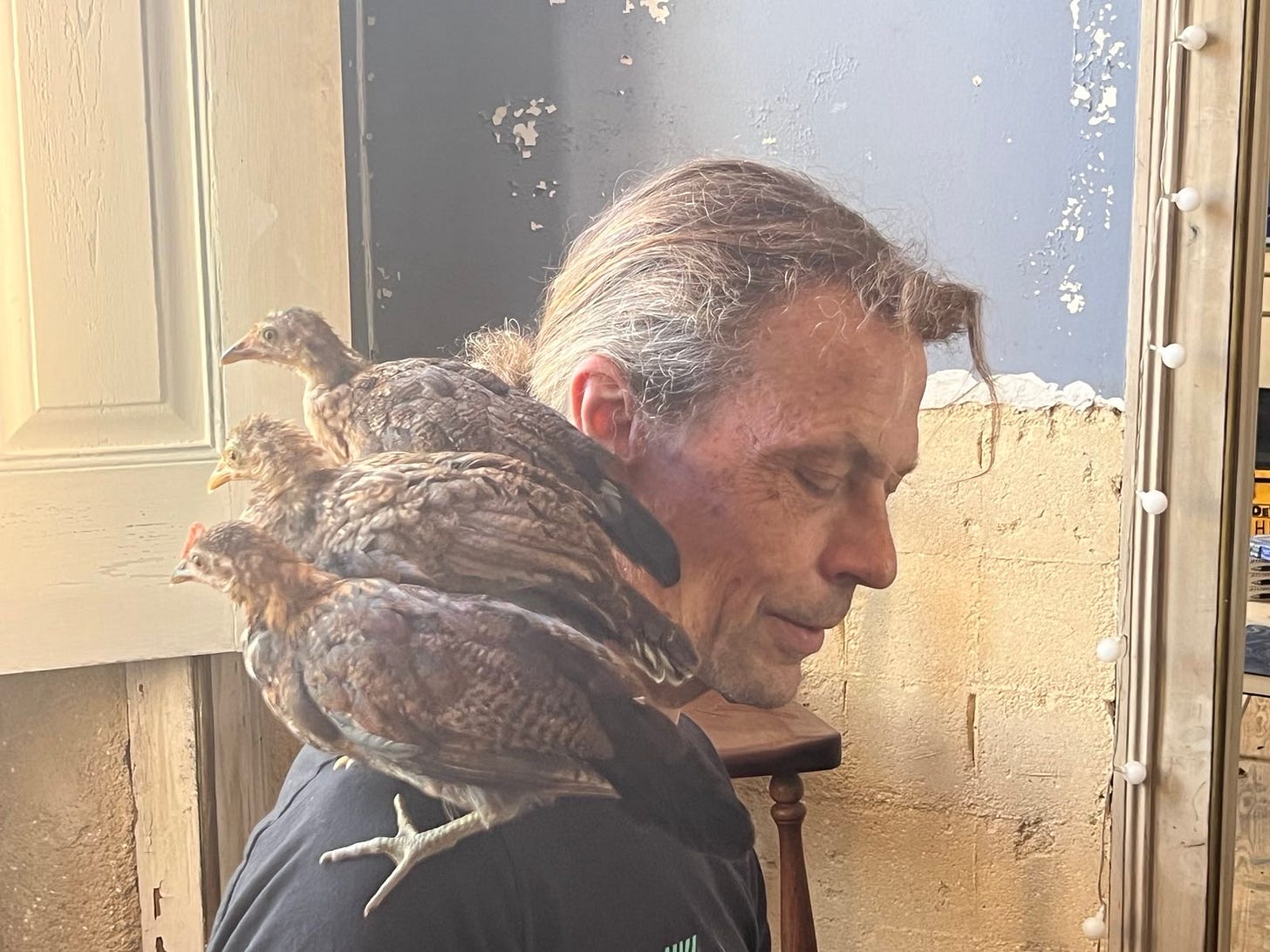 In the kitchen I cut up grapes and blueberries and apples for my little hens and head over to the palaceta where Sophia and Tasan do not generally rise before noon. I set out a plate of apple slices and a pan of toasted cornbread for the kids. Then I opened the door to the hen nursery and the four of them came rushing out, jumping on my feet in excitement for their morning snack.