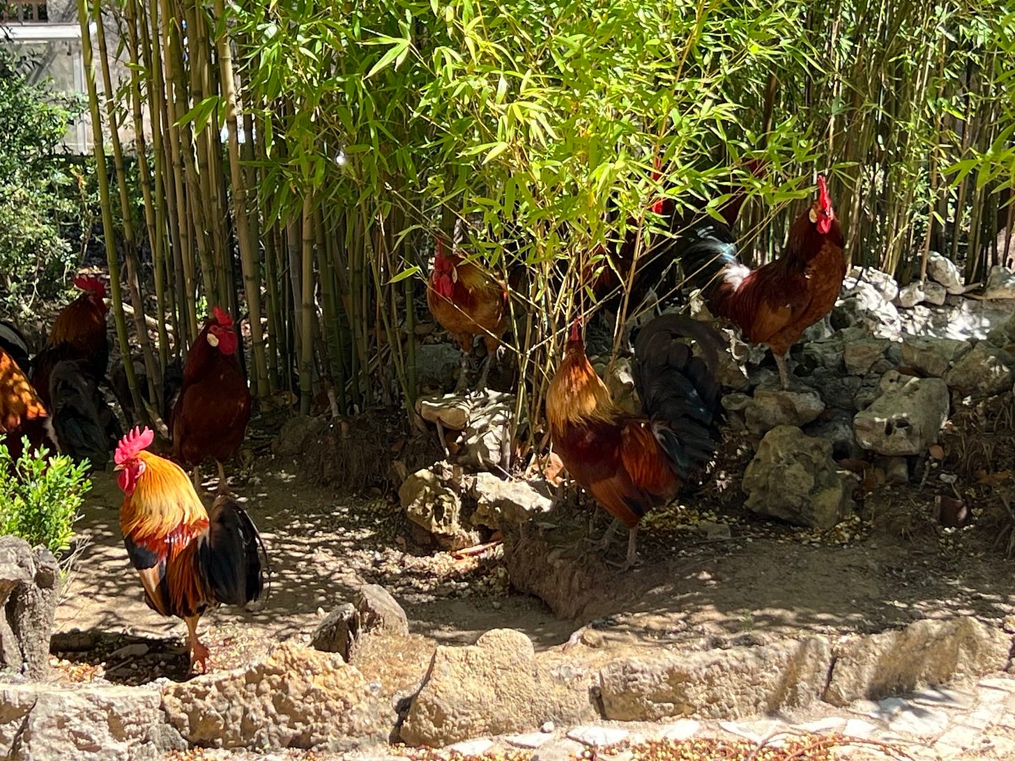 The h is tending the garden and fruit orchard and olive trees. The olive trees the h and crew cut back so brutally in June are growing gangbusters, helped along by a long string of days of hot sunny weather. After the big trimming party we held in the Secret Garden, including taking several trees down, the sun is finally penetrating the canopy again and the leggy boxwoods that form the winding paths around the half acre Secret Garden are rapidly filling in. The flock spends its days lazing among the bamboo that grows around the koi pond near the chicken waterer.